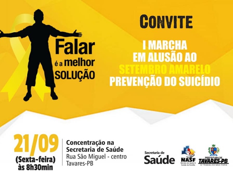 O município de Tavares vai realizar na sexta-feira (21) a Marcha da campanha Setembro Amarelo de prevenção do sucicídio. A mobilização está sendo convocada pela Secretaria de Saúde como parte das atividades da campanha de prevenção ao suicídio no município.