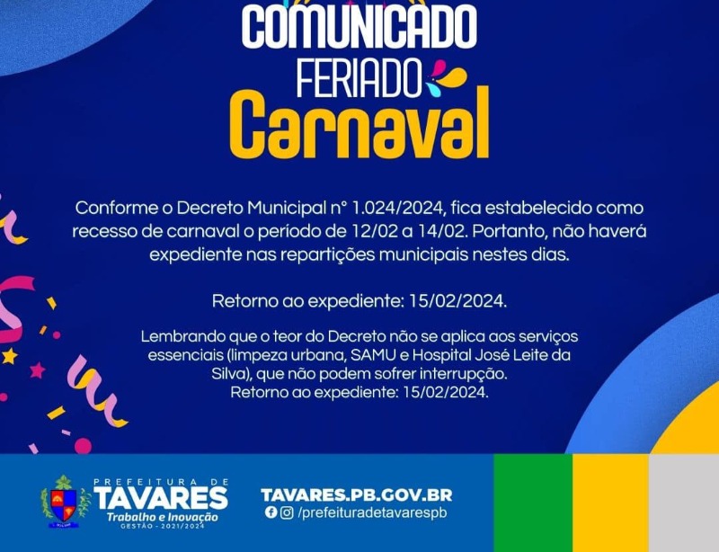 O Município de Tavares publicou através de Decreto (nº1.024/2024) ponto facultativo entre os dias 12 e 14 de fevereiro. A medida tem como efeito a suspensão do expediente nas repartições públicas em consideração ao período de carnaval.