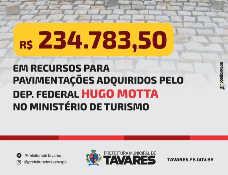 O Prefeito Dr. Ailton Suassuna, conseguiu com o Deputado Federal Hugo Motta a liberação de mais de 200 mil reais no Ministério do Turismo do Governo Federal. O recurso será para realização de obras de pavimentação no município de Tavares. Cabe destacar que a Prefeitura através da Secretaria de Obras já realizou a pavimentação de mais de 70 ruas, beneficiando centenas de famílias tavarenses, que não convivem mais com lama e poeira em suas portas.