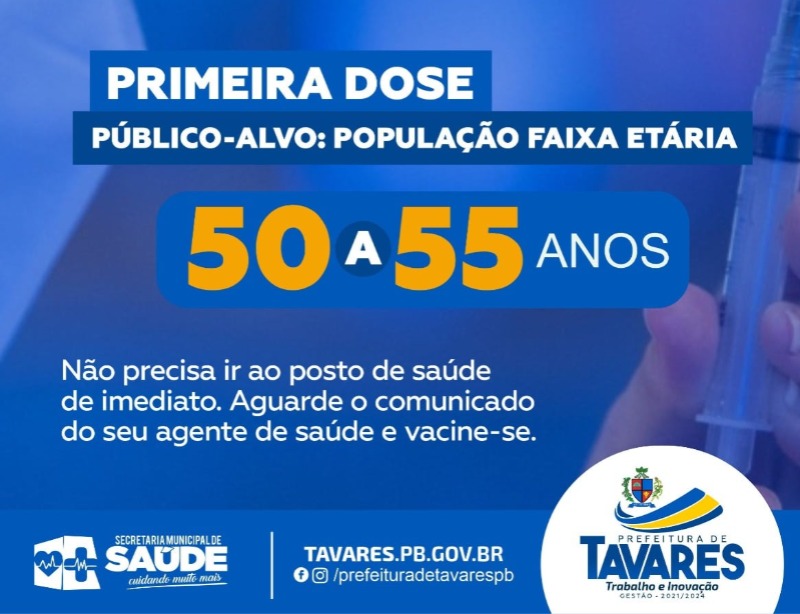 A Secretaria de Saúde de Tavares iniciou esta semana a aplicação da primeira dose da vacina contra a Covid-19 no público-alvo formado por pessoas com idades entre 50 e 55 anos. A cobertura vacinal contra o novo coronavírus vem sendo ampliada pelo Município de acordo com o cumprimento do Plano Nacional de Imunização (PNI) estabelecido pelo Ministério da Saúde.
